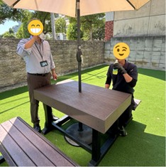 納品当日は、営業部の上司と物流グループの同僚と私の3人で伺いました。天気は快晴…というより猛暑で、全員汗を流しながら既設テーブルの撤去と新しいテーブルの設置作業を行い、無事完了しました!