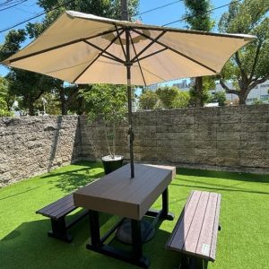ちなみにテーブルの両脇に設置されているベンチは、2023年に購入いただいたエコマウッド製のベンチです。約2年屋外で使用されているため多少色あせはしていますが、ひび割れや腐食もなくエコマウッドの耐久性を改めて実感しました。