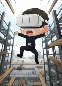 フォークリフトが目の前に猛スピードでバックしてきて衝突する場面では思わず悲鳴が上がり、建設作業現場での高所体験では足元に見える景色があまりにリアルで腰が引けてしまう社員も続出するほどでした。まるで実際の現場に立っているかのような緊張感を味わえました。