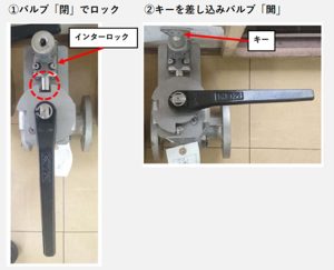以下の写真の場合、写真①のバルブが「閉」の状態でロックされるように設計しています。写真①の上部、インターロックの鍵穴に専用のキーを差し込み回すと、赤丸部分のストッパーが引っ込みます。するとロックが解除されハンドルを動かすことができ、写真②のようにバルブを「開」の状態にすることが可能です。